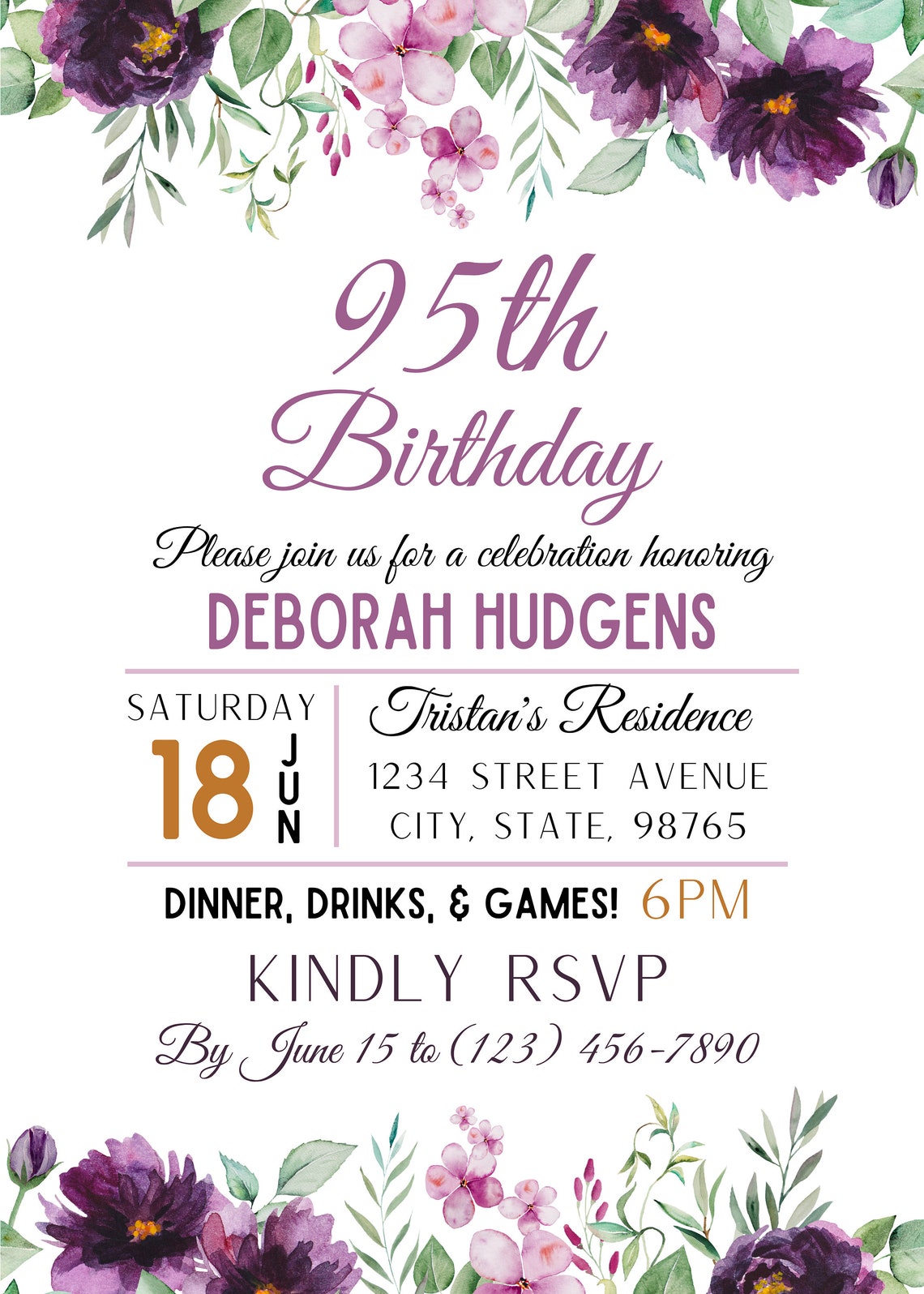 Editable 95th Birthday Invite 95th Birthday 95th Birthday Ideas 95th - Elegant pink & gold floral woman's 95th birthday. Purple floral green leaves 95th. 95th birthday party invitation, cupcakes galore ca… have any questions? These invitation templates are specially designed to commemorate a milestone birthday celebration. Choose from a wide range of designs or create your own from scratch! You should also read this: Coraline Invitation Template
