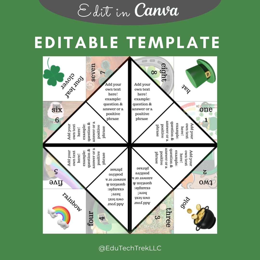 Editable St. Patrick's Day Cootie Catcher Canva Template Etsy - Instantly download and easily edit these cootie catcher templates for customized games for your wedding, rehearsal dinner, fundraiser, or any other special event! Save time creating printables for your business with these canva commercial. These origami fortune tellers go by many different names; To make your valentine’s day even more special, i’ve created this free printable valentine cootie catcher that. You should also read this: Real Doctors Note For Work Template