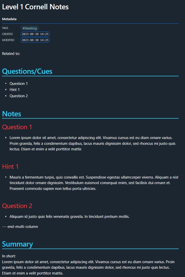 Cornell NoteTaking System in Obsidian Share & showcase Obsidian Forum - The cornell method offers a specific layout for each page of notes. I just figured out a way to note down questions/key points/… on the side just like on paper using obsidian. This project uses typescript to provide type checking and documentation. Cue/question column (left) — is used to write down questions, keywords, or cues. Save lesleylai/239c8f586fb79806713dd65419759bb2 to your computer. You should also read this: Nfr Back Number Template