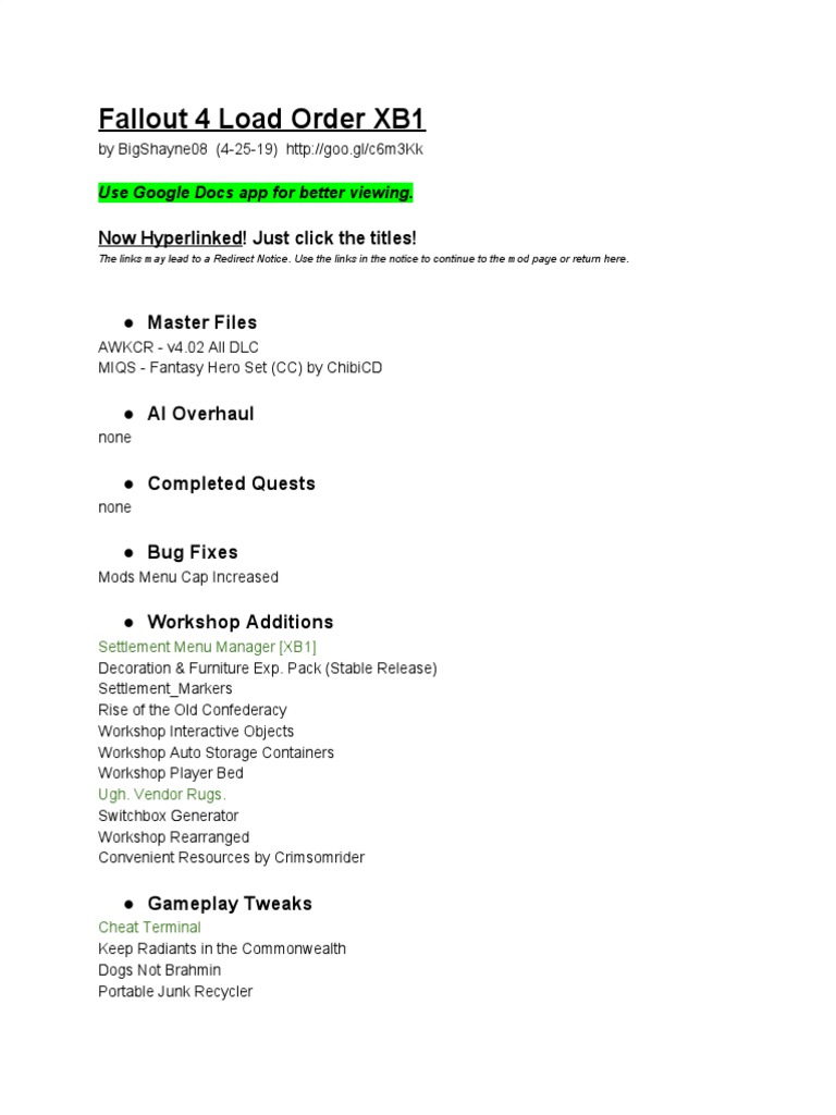 [FO4] [XB1] Mod Load Order Template for anyone struggling with crashes - Here's the template for your load order: Always read a mod description to see if. This is based off of fallout 4 load order template and fallout 4 load order framework from the post fallout 4. This document provides a load order for fallout 4 mods on the xbox one. A vault dweller's load order survival guide is designed to. You should also read this: Schedule A Meeting Email Template