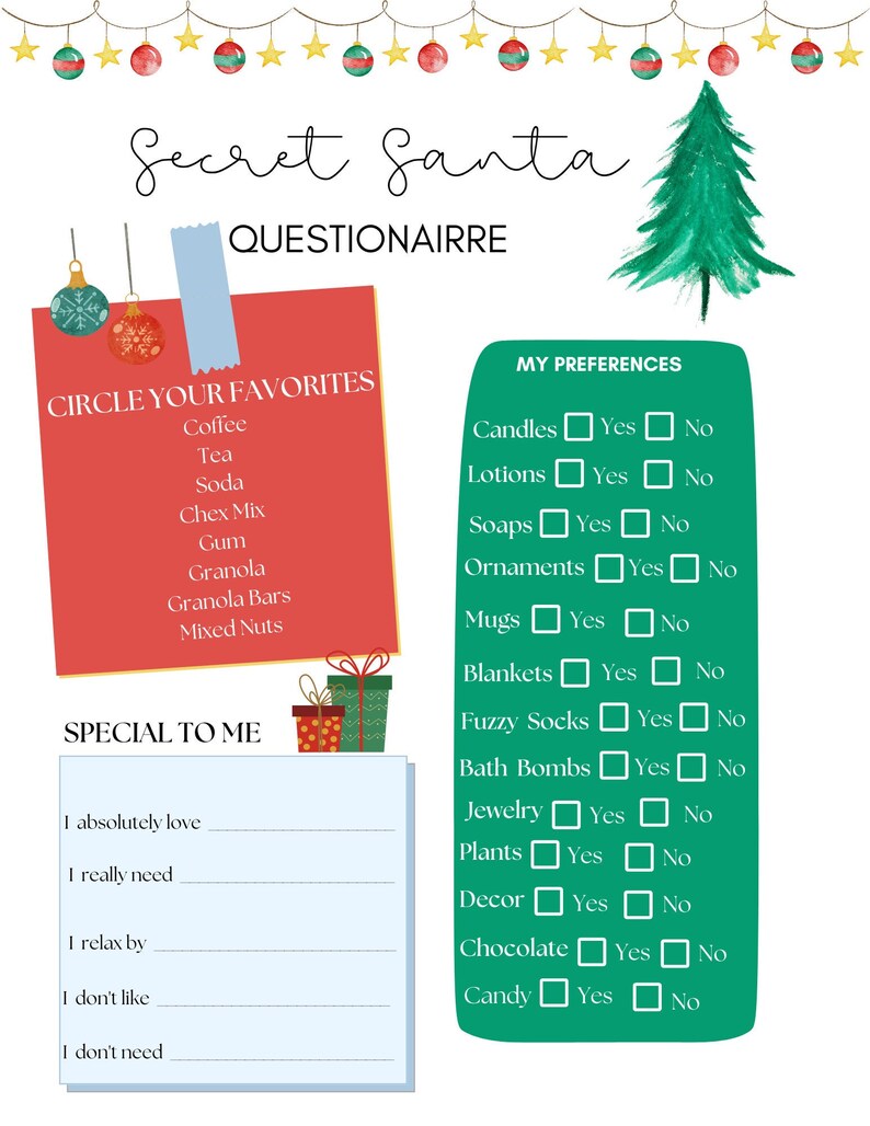 Secret Santa Questionnaire Template Christmas Gift Exchange Etsy - We’ve designed a blank template for those who want to get extra creative and come up with their own unique questions. Customize and download this employee gift questionnaire hr. This sample survey template is designed to accommodate. Enhance this design & content with free ai. The secret santa questionnaire has four simple questions that focus around traditional secret santa gifts. You should also read this: Free Fall Printable Templates