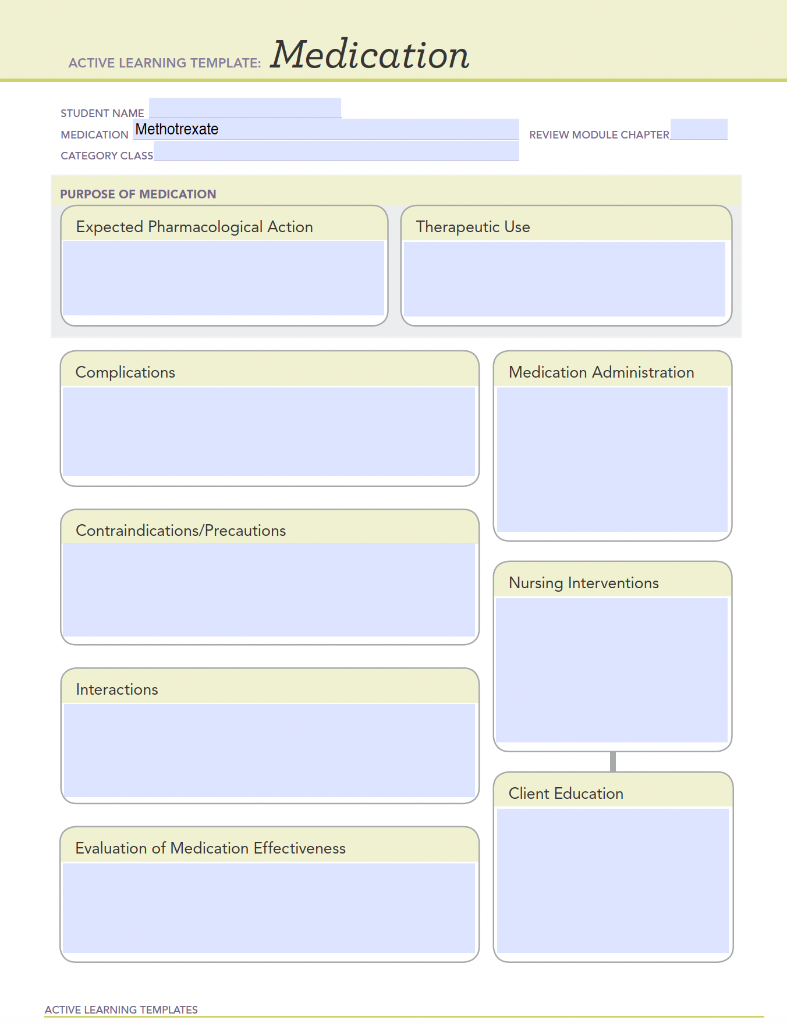 Solved Medication ACTIVE LEARNING TEMPLATE STUDENT NAME - Learn about dosing, side effects, and nursing considerations for this commonly prescribed chemotherapy. 100% satisfaction guarantee immediately available after payment both online and in pdf no strings attached. Expected pharmacological action inhibits folic acid conversion to stop cell reproduction needed for dna synthesis. Avoid crowds and contact with. Methotrexate is also used to treat severe psoriasis and. You should also read this: Transcript Template Google Docs